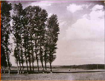<広いゴルフ場の中のポプラ並木>