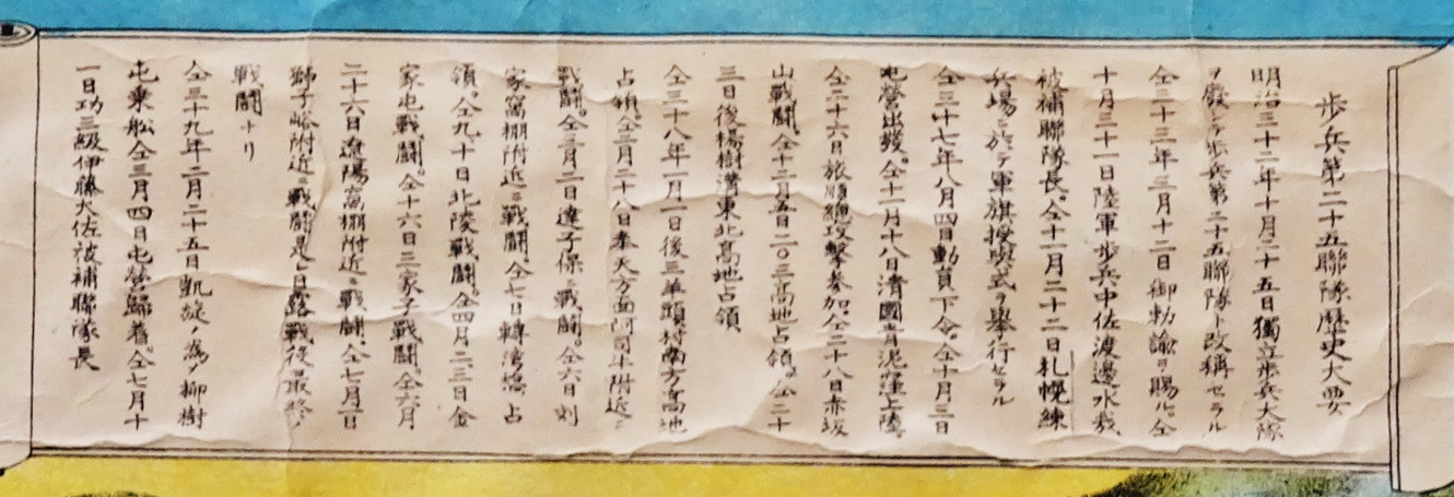 明治三十三年十月二十五日獨立歩兵大隊ヲ廢シテ歩兵第二十五聯隊ト改稱セラル仝三十三年三月十二日御勅諭ヲ賜ル。 仝十月三十一日陸軍歩兵中佐渡邊水裁被補聯隊長。仝十一月二十二日札幌練兵場ニ於テ軍旗授與式ヲ擧行セラル仝三十七年八月四日動員下令。仝十月三日屯營出發。仝十一月十八日清國青泥窪上陸。仝二十六日旅順攻撃参加。仝二十八日赤坂山戰闘。仝十二月五日二〇三髙地占領。仝二十三日後楊樹溝東北髙地占領。