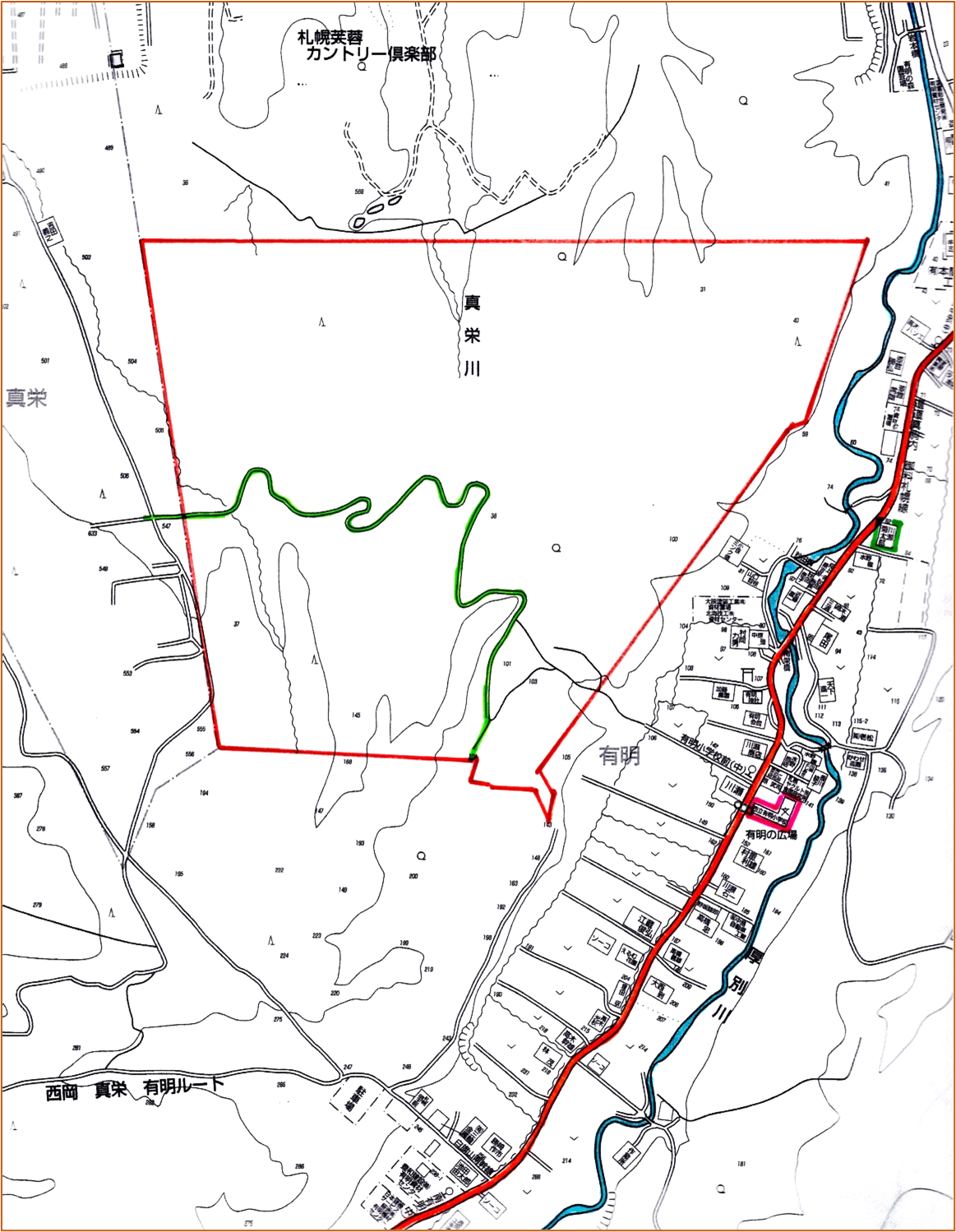 有明地域の「公有地」と「学校林」の境界線を概略知ることが出来ます。
