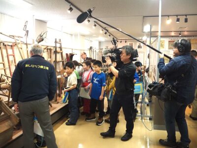 北野小学校の3年生児童65人が3月4日(月)、あしりべつ郷土館に来館しました。館内に展示している昔の生活道具や農機具を、郷土館のスタッフの解説を聞きながら見て回りました。