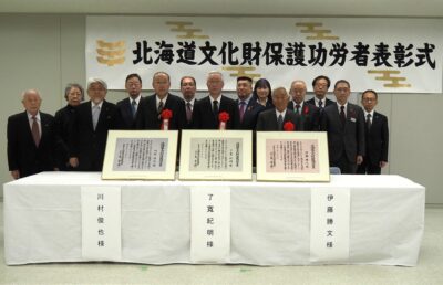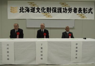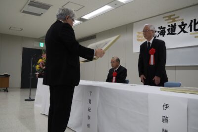今年の功労者表彰は、了寛さんと、深川市の伊藤勝文さん(深川市の文化財保護活動、猩々獅子五段くずし舞の保存活動)、別海町の川村俊也さん(郷土の貴重な写真、音源、書籍、地図、文書を数多くデジタル化して公共機関に寄贈)の3名が表彰されました。